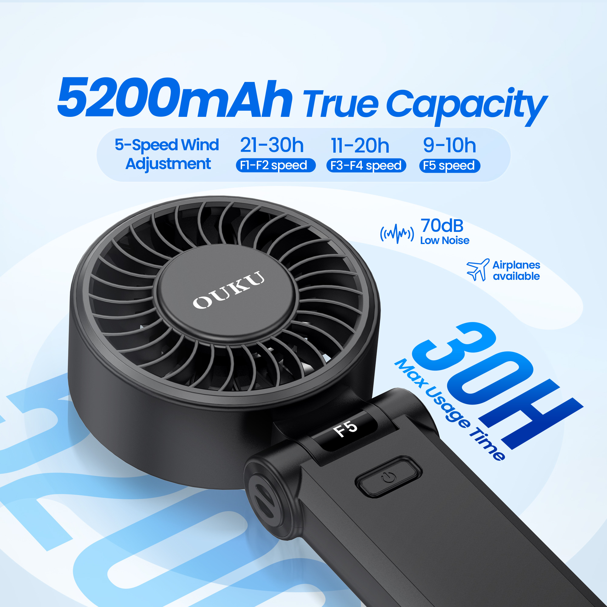 OUKU FS03 พัดลมมือถือ 5200mAh ปรับความแรงลมได้ 5 ระดับ จอแสดงผล LED น้ำหนักเบา แรงลมสูง พัดลมพกพา พร้อมกล่อง บริการสกรีนโลโก้ฟรี